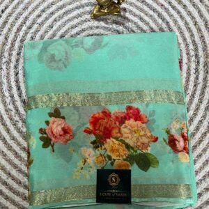 Mint Green Floral Printed Chiffon Saree with Gold Woven Border
