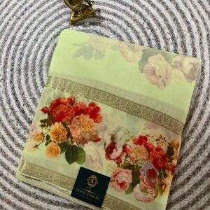Pastel Green Floral Printed Chiffon Saree with Gold Woven Border
