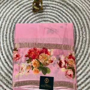 Soft Pink Floral Printed Chiffon Saree with Gold Woven Border