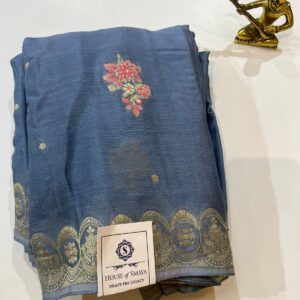Steel Blue Chiffon Saree with Antique Gold Zari Border & Floral Motif