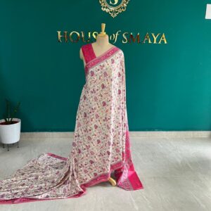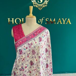Ivory Malai Silk Saree with Rani Pink Madhubani Print Border – House of Smaya