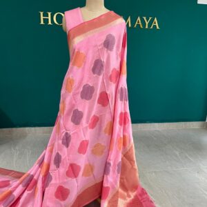 Organza Silk Pink Saree with Multicolor Floral Motifs & Golden Border