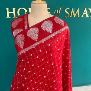 Bandhani Red Saree with White Tie-Dye & Leaf Border