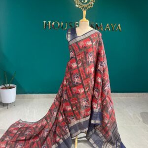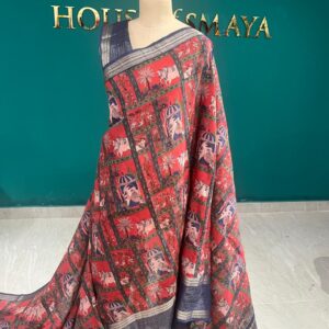 Handcrafted Red & Blue Printed Saree with Artistic Motifs