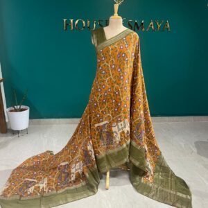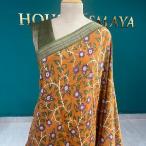 Mustard Yellow & Olive Green Printed Saree with Ethnic Motifs