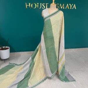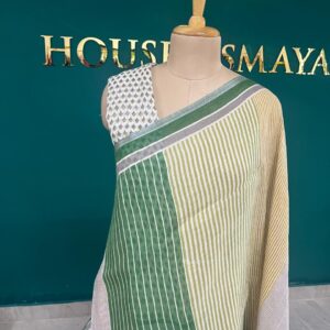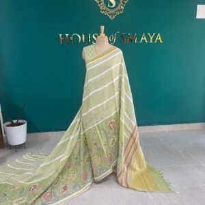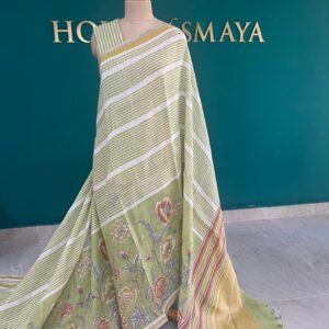 Pastel Green Linen Saree with Floral Embroidery and Striped Pattern