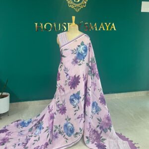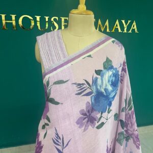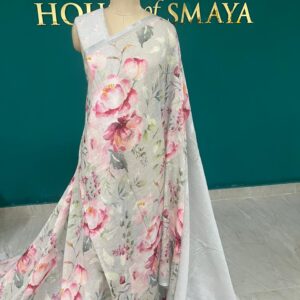 White Linen Saree with Pink Floral Digital Print – House of Smaya