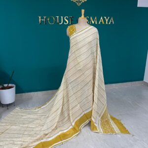 Beige Linen Saree with Mustard Border and Woven Stripes