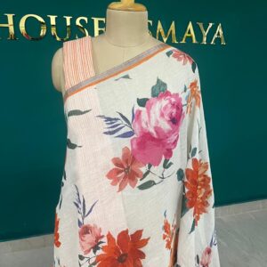 Off-White Linen Saree with Vibrant Orange & Pink Floral Print – House of Smaya