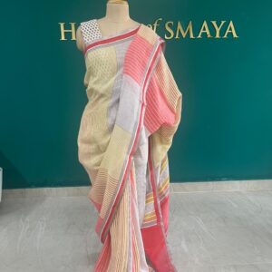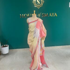 Multicolor Striped Linen Saree with Subtle Red and Yellow Accents – House of Smaya
