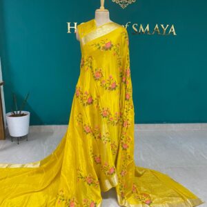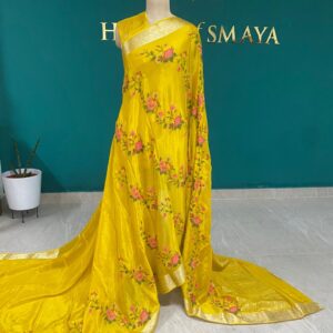 Sunshine Yellow Floral Silk Saree with Golden Zari Border