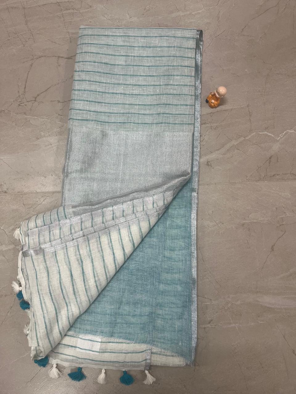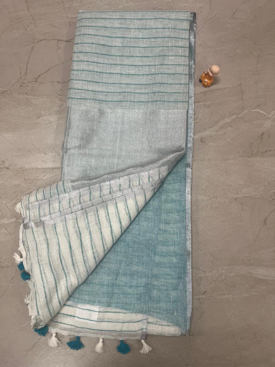 A refreshing aqua blue and white linen saree featuring delicate stripes, a subtle silver border, and handcrafted tassel detailing. Lightweight, breathable, and perfect for elegant everyday wear or summer festivities.