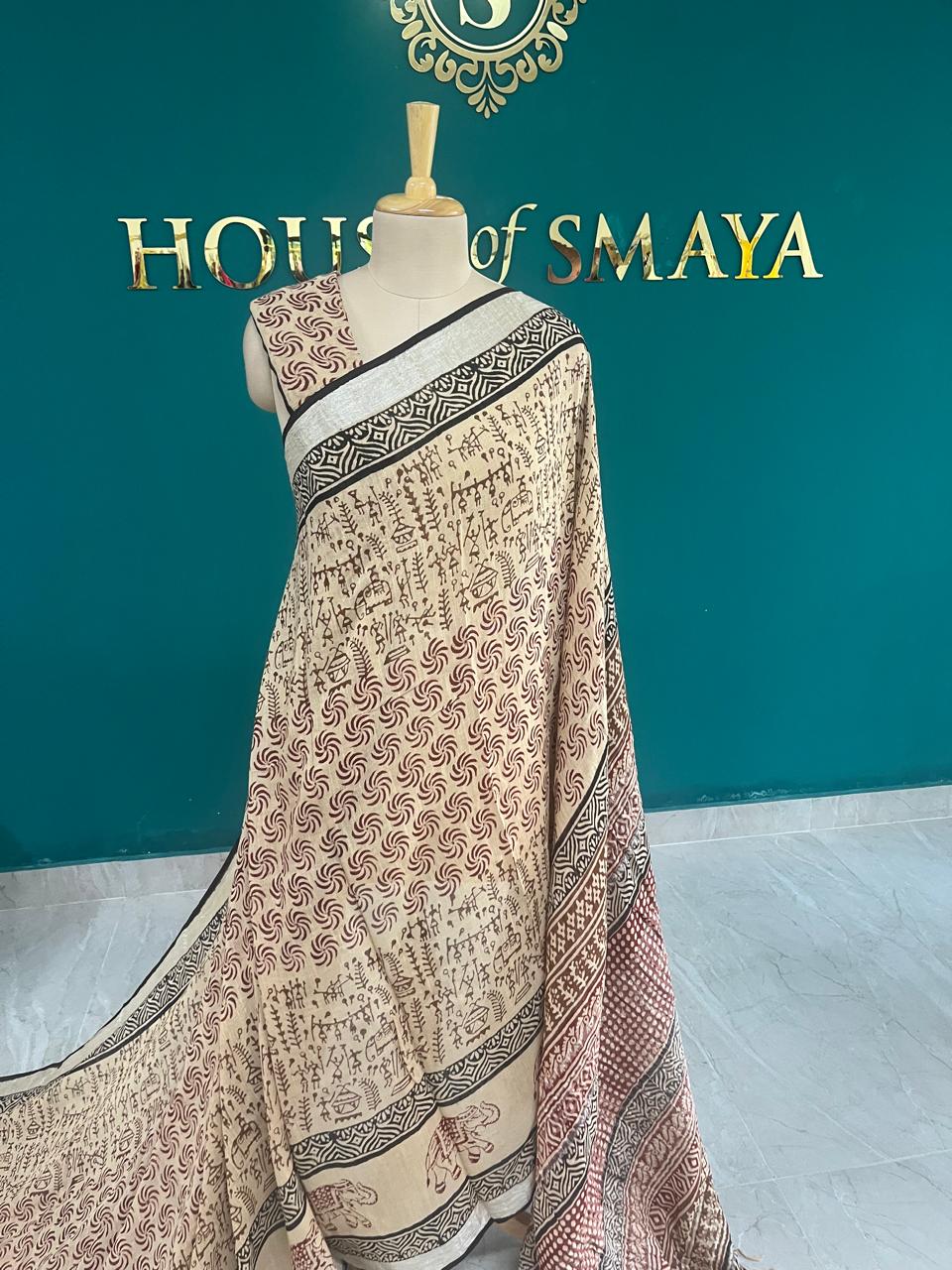 An elegant beige Linen Cotton saree featuring intricate traditional block prints in earthy tones. Lightweight, breathable, and perfect for everyday elegance or cultural gatherings.