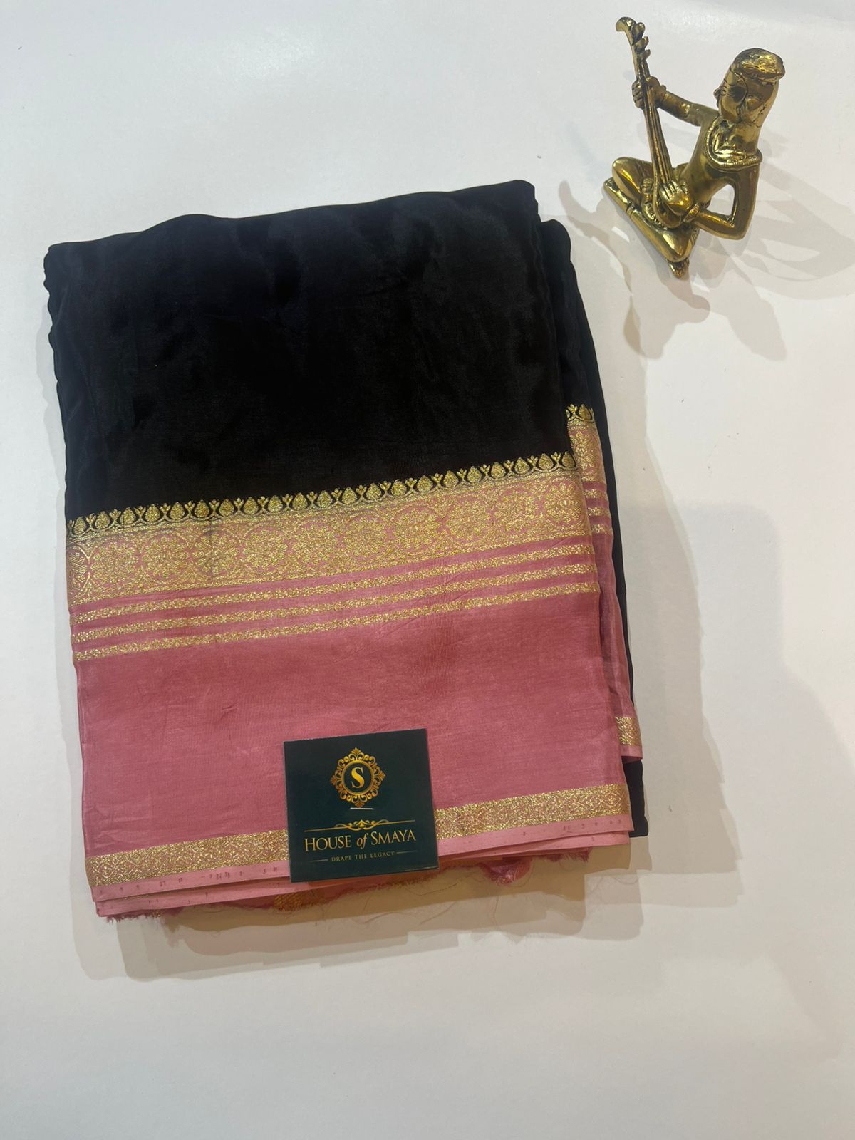 Black & Blush Pink Semi Crepe Saree with Elegant Gold Zari Border