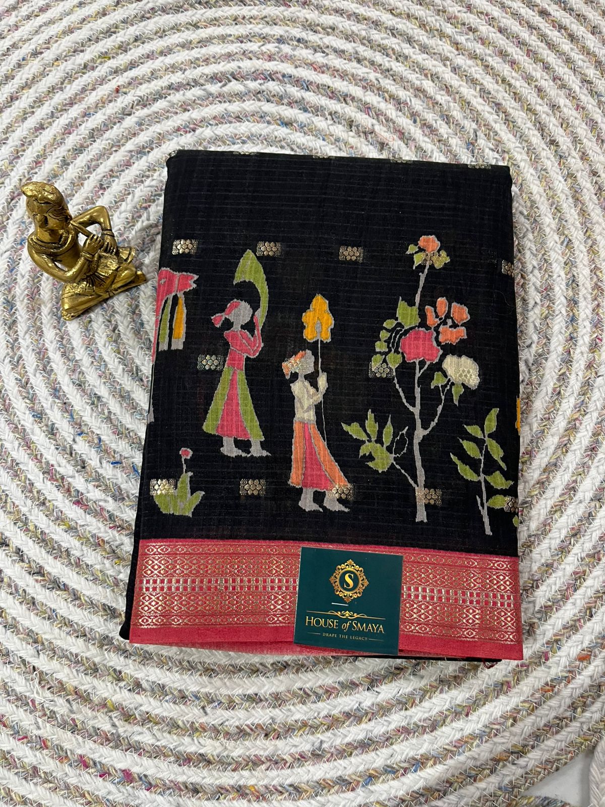 This black Kora cotton saree is a beautiful expression of folk artistry and handcrafted charm. Designed on a rich black base, the saree showcases traditional folk-inspired human figures, floral elements, and nature motifs in vibrant hues of red, green, mustard, and ivory, creating a storytelling canvas across the drape.