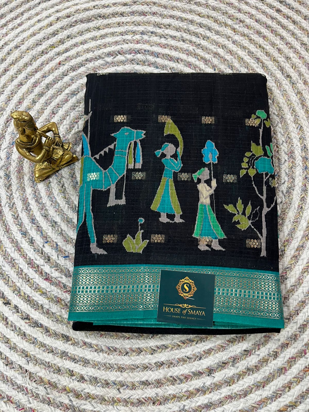 Celebrate earthy elegance with this black Kora cotton saree, inspired by traditional tribal art and storytelling motifs. Woven in breathable Kora cotton, the saree features handcrafted-style figures, camels, trees, and folk elements in soothing teal and muted tones, set beautifully against a deep black base.