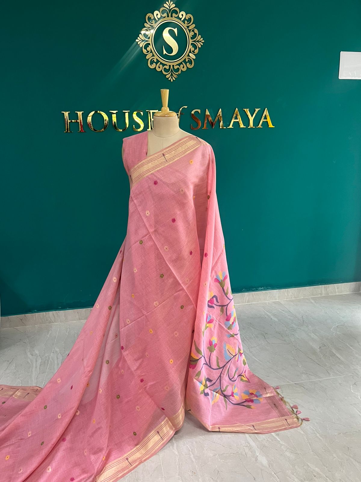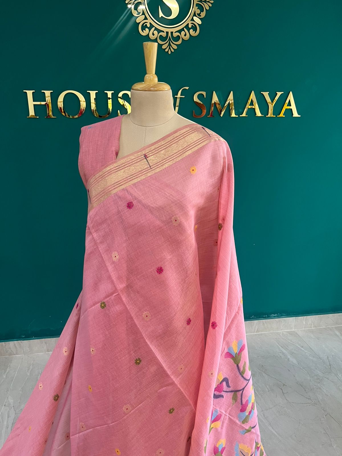 Blush Pink Cotton Silk Saree with Multicolor Thread Embroidery – House of Smaya