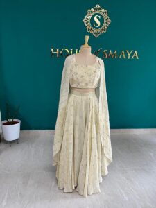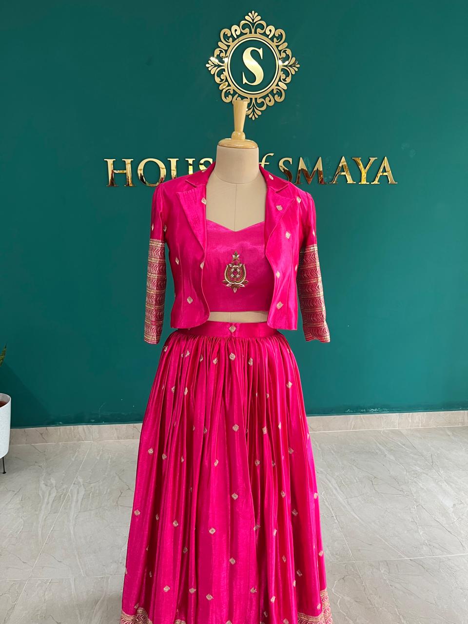 A festive bright pink lehenga set with blouse, jacket, and flared skirt detailed with golden motifs and zari border – perfect for weddings, parties, and traditional occasions.