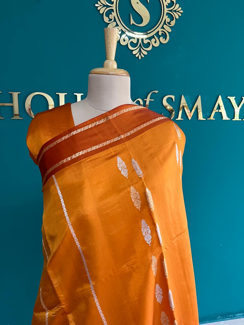 Burnt Orange Pure Raw Mango Silk Saree with Silver Butti Work