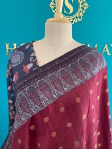 The highlight lies in its vibrant ethnic border, featuring intricate handcrafted-style motifs in red and blue tones that create a striking contrast against the deep black base. Minimal yet expressive, this saree is perfect for women who love understated charm with a touch of tradition.