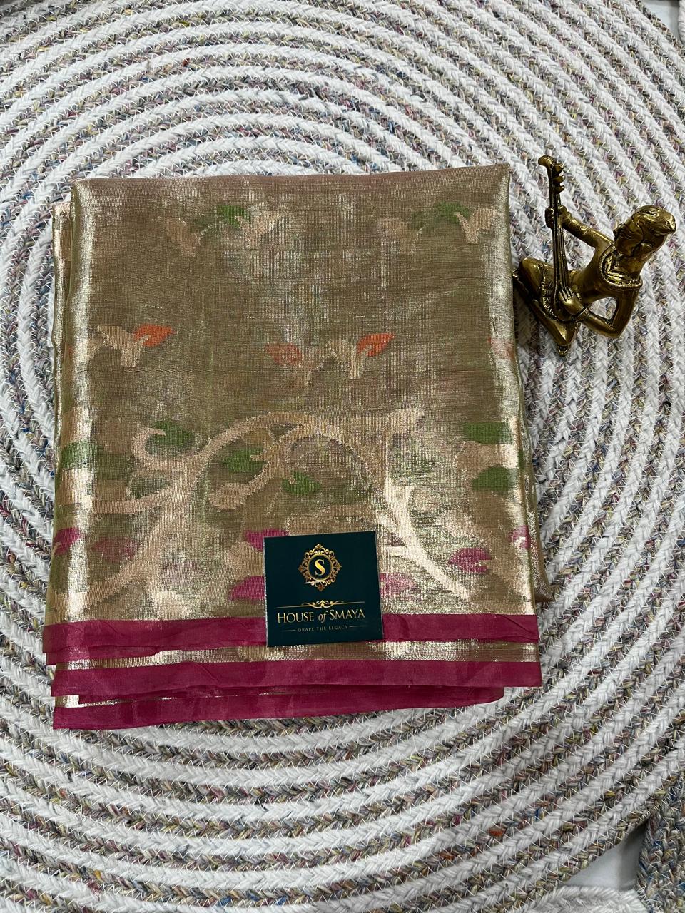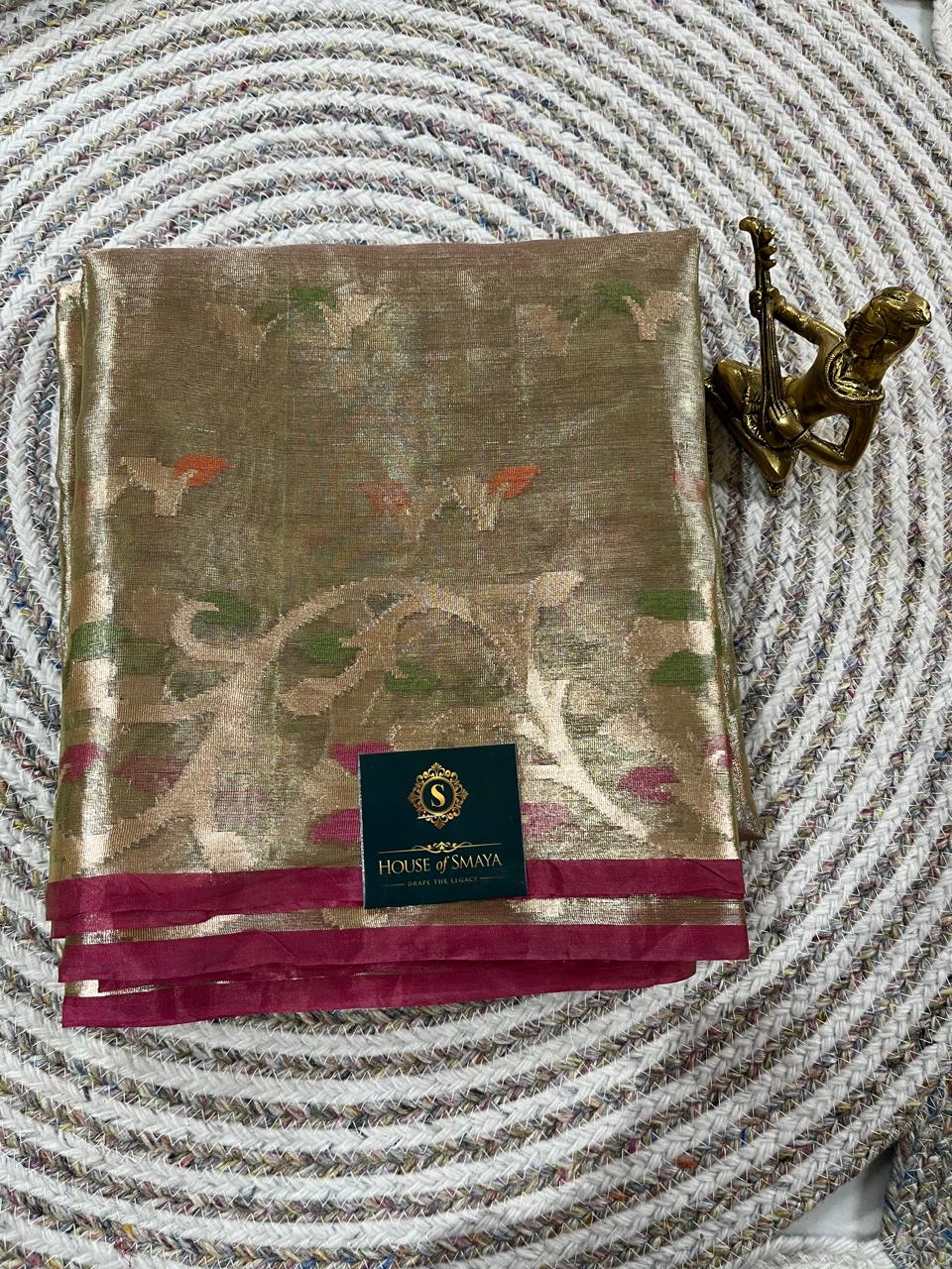 Elegant Gold-Toned Semi Tissue Saree with Floral Weave & Contrast Border