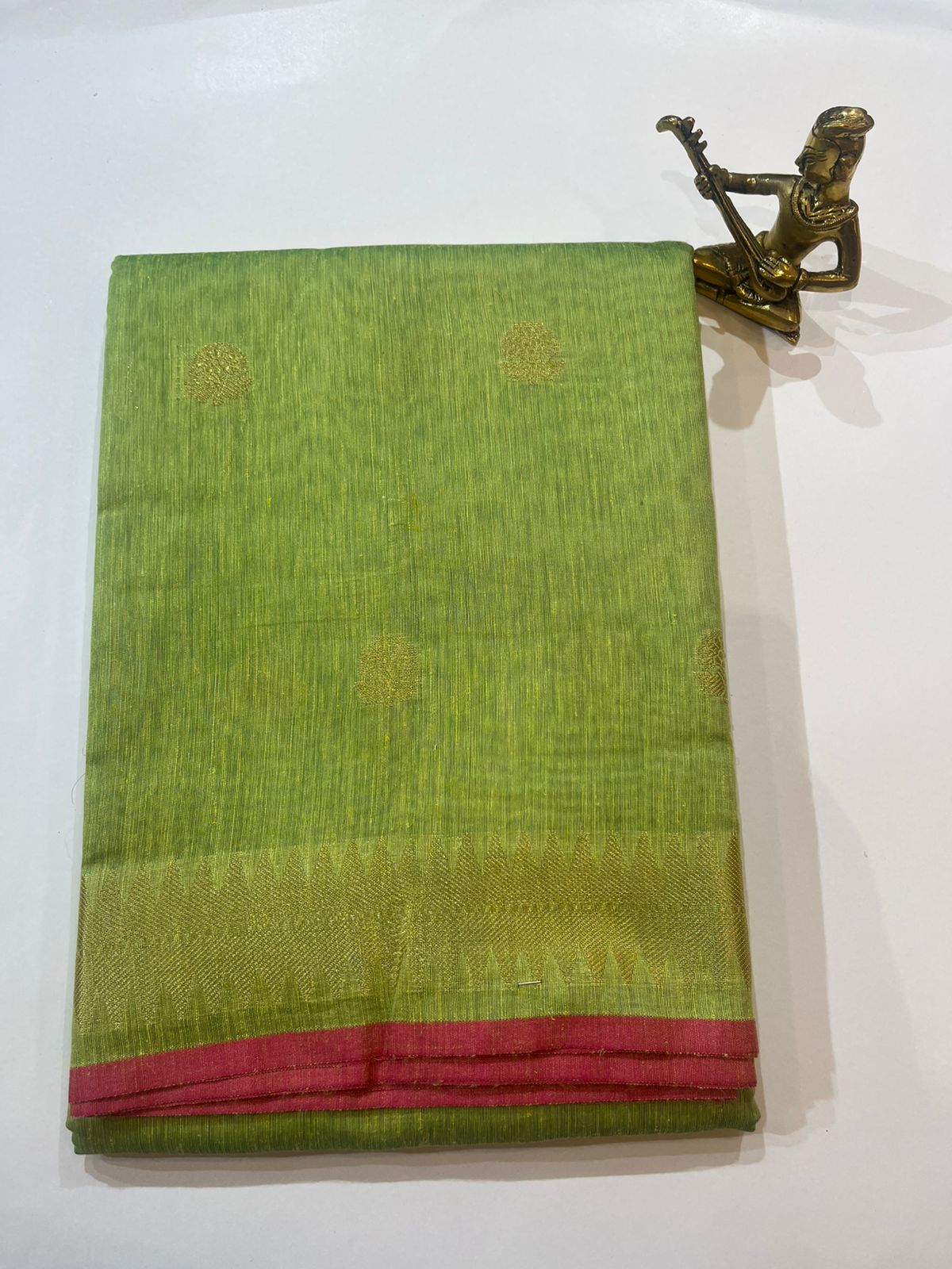 Fresh Parrot Green Banarasi Cotton Saree with Gold Buti & Contrast Pink Border