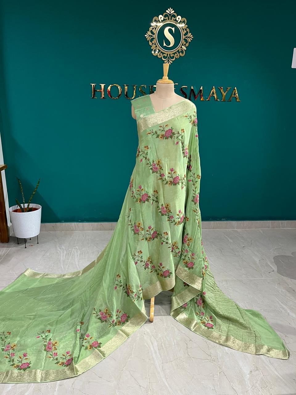 Step into elegance with this Pastel Green Saree from House of Smaya, beautifully designed with floral embroidery across the body and a golden zari border that adds a regal touch. This saree is perfect for festive occasions, weddings, and cultural events.
