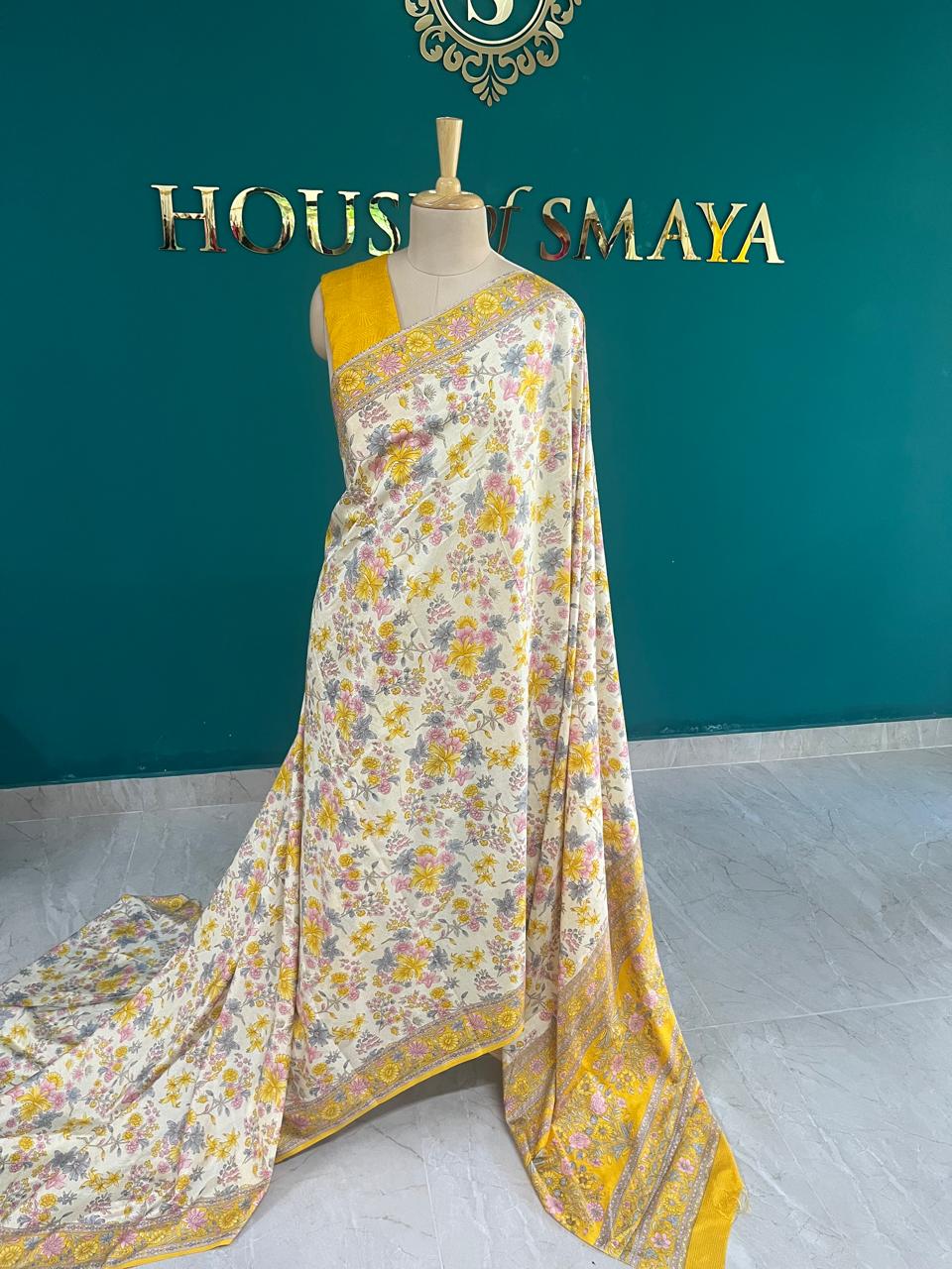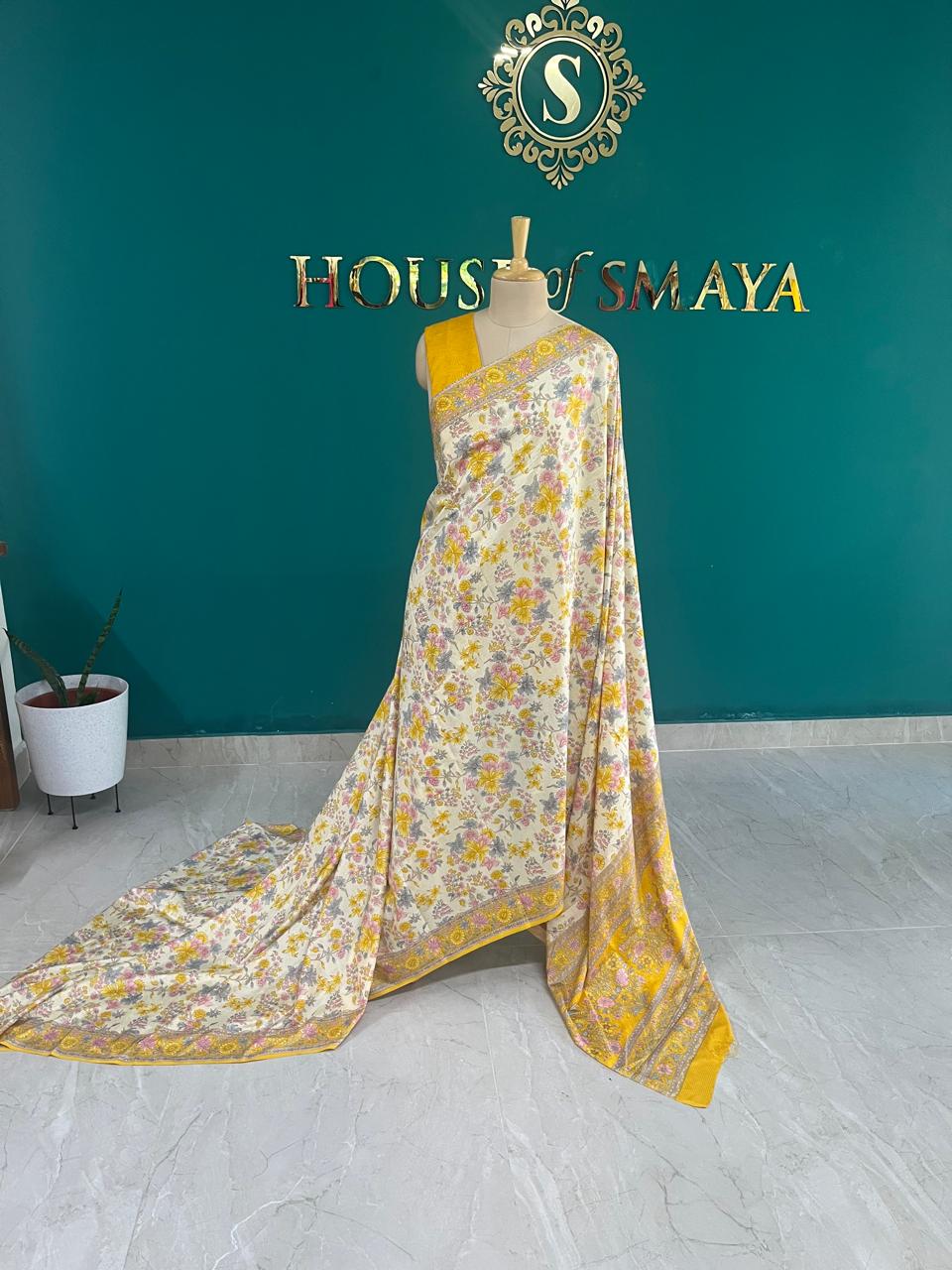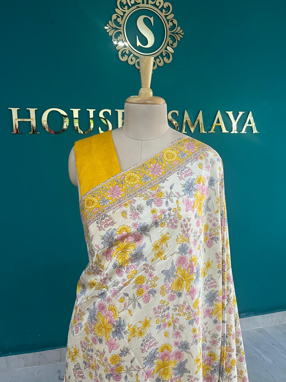 Ivory Malai Silk Saree with Yellow Floral Print and Contrast Border