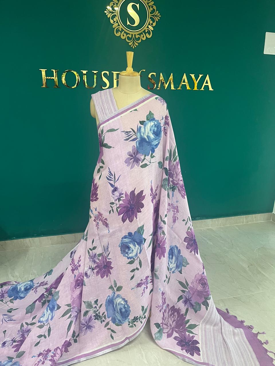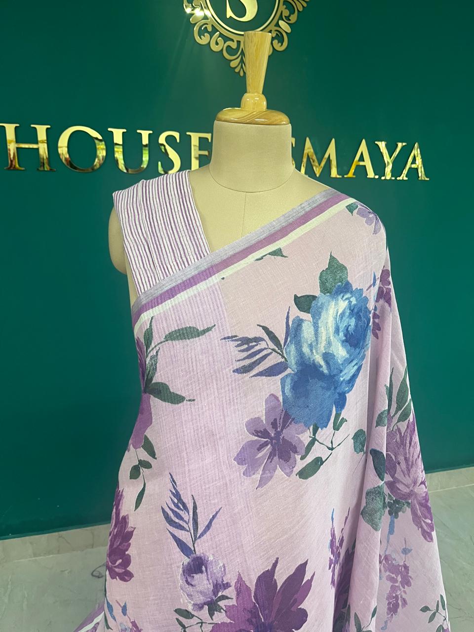 A charming lavender linen saree adorned with vibrant blue and purple floral prints. Lightweight, breathable, and effortlessly elegant — perfect for daytime sophistication and festive grace.