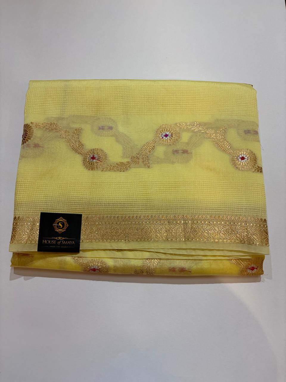 Lemon Yellow Organza Saree with Zari Floral Vine Border