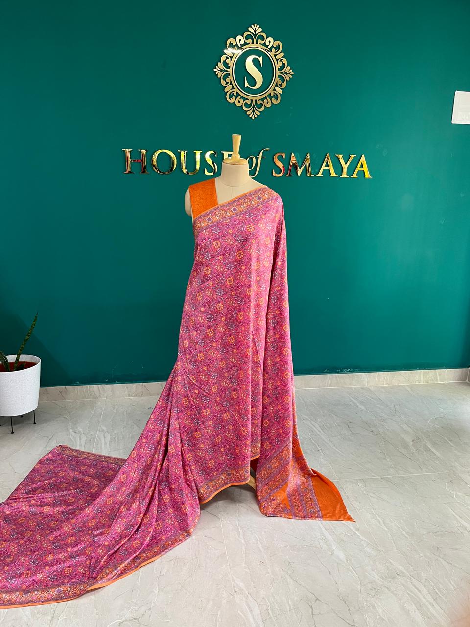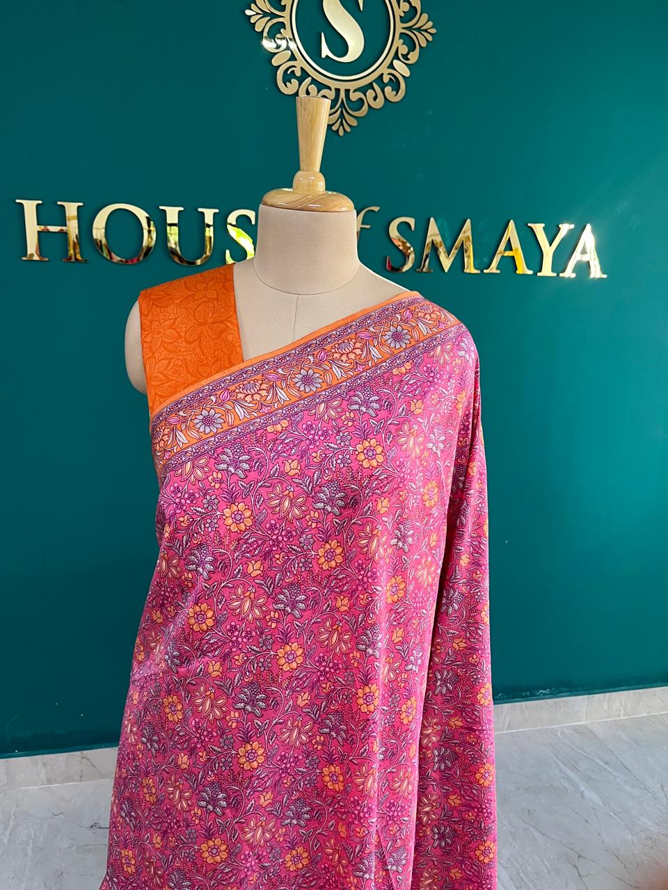Magenta and Orange Malai Silk Saree with Intricate Floral Print