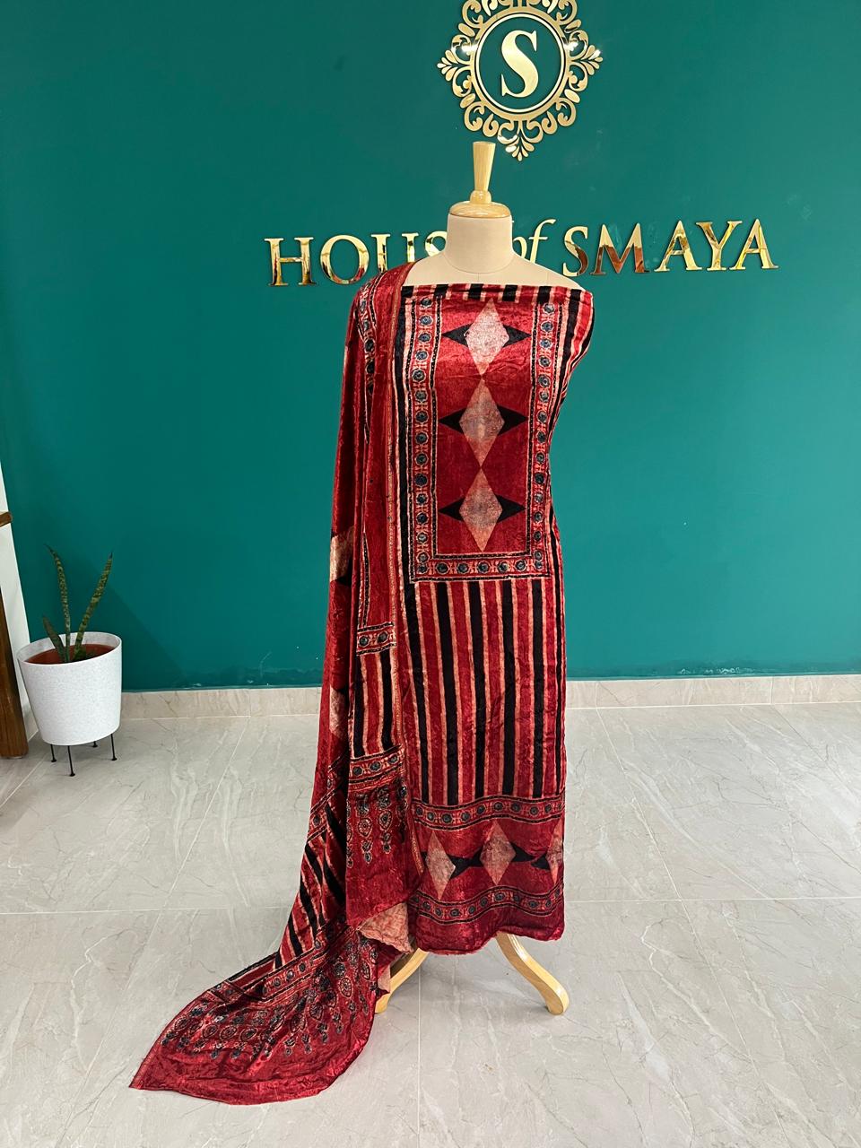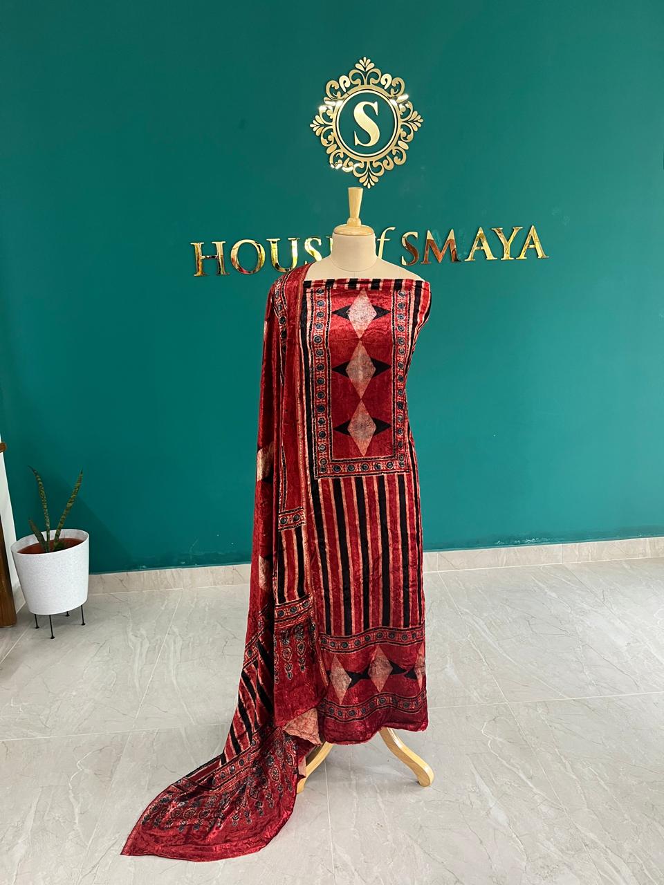 Luxurious velvet top and dupatta set in deep maroon, featuring striking geometric motifs and stripes – ideal for weddings, festive occasions, and winter celebrations.