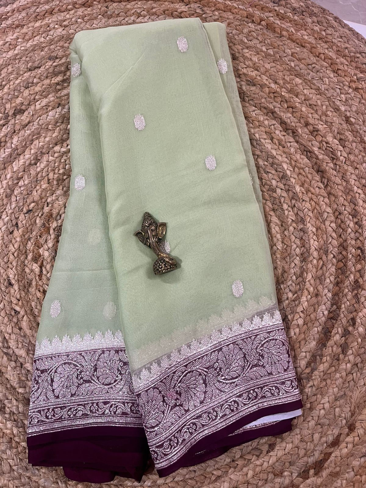 Mint Green Pure Khaddi Chiffon Saree with Silver Zari Border