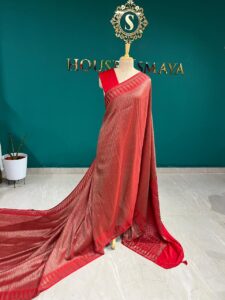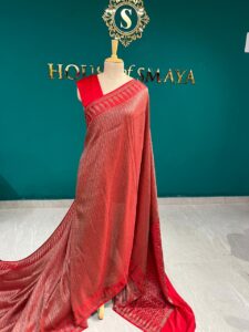 A vibrant multicolor Banarasi silk saree featuring rich shades of red, purple, and pink, paired with elegant golden zari motifs. The unique wave-patterned design and intricately woven floral border add a festive charm, making it a perfect choice for weddings, celebrations, and traditional occasions.