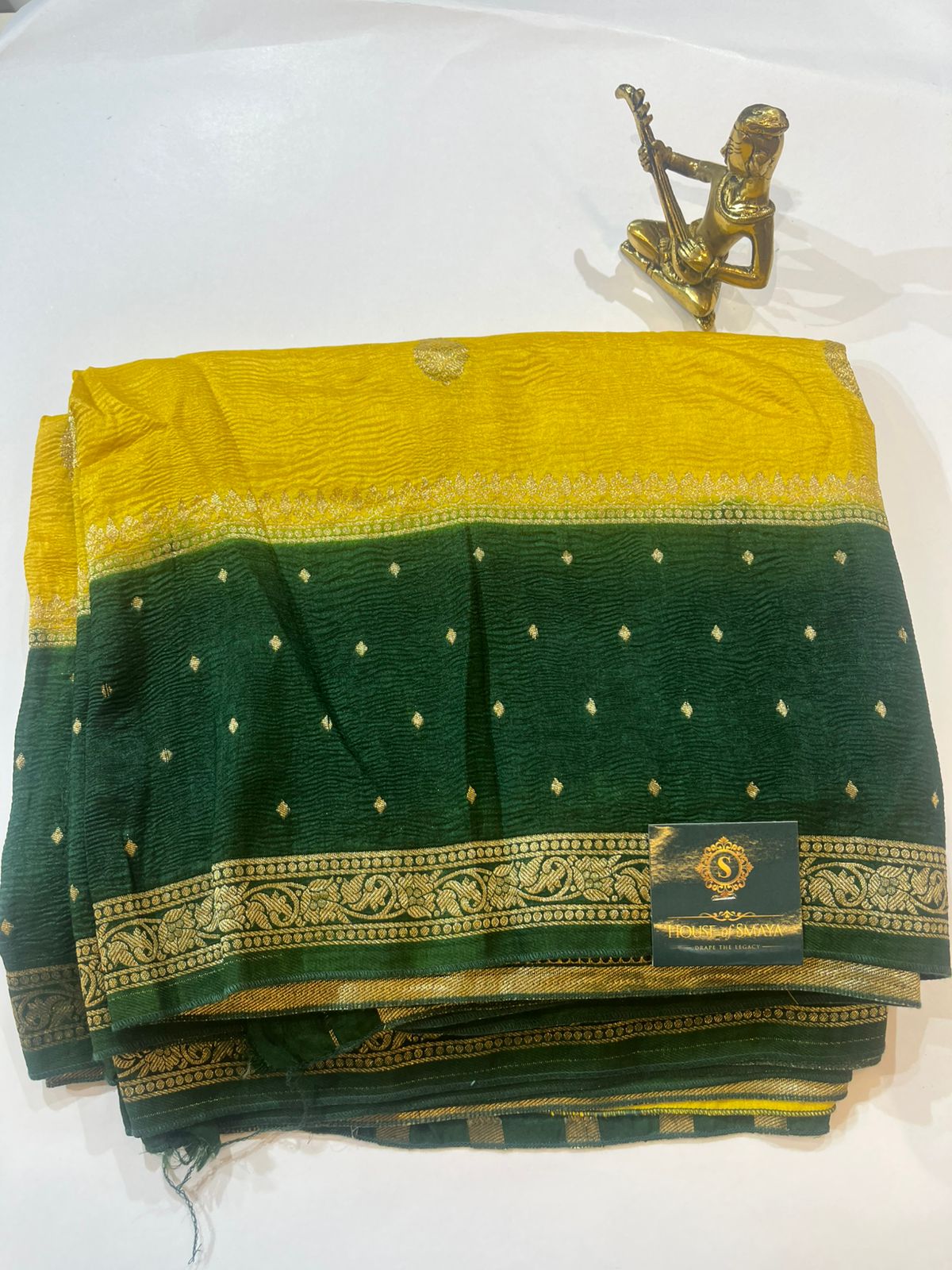 Mustard Yellow & Bottle Green Georgette Tussar Saree with Zari Buta Border