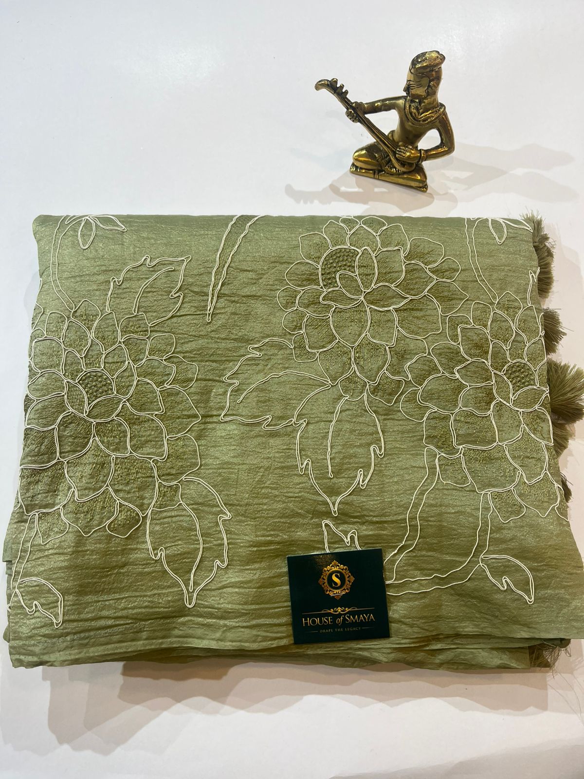 Elevate your elegance with this graceful Organza saree in a soothing olive green shade, adorned with delicate all-over floral thread embroidery. The saree features finely outlined floral motifs crafted in subtle contrasting threads, giving it a refined and artistic appeal.