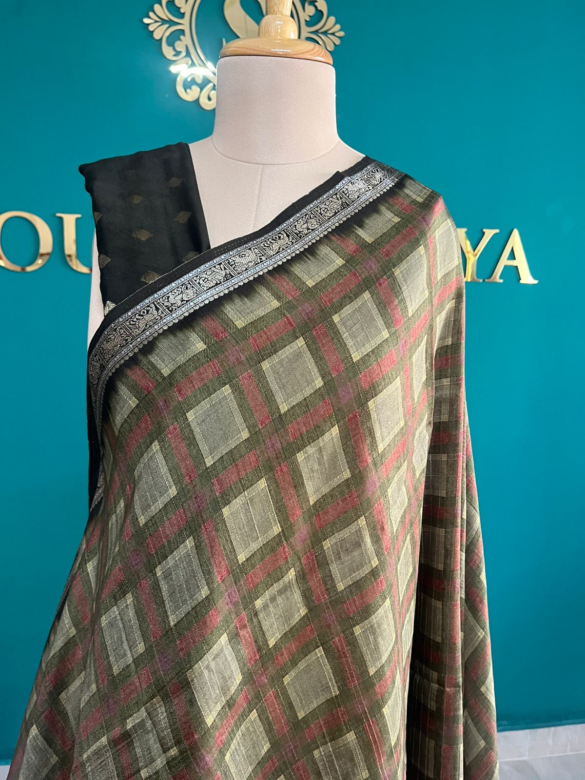 Olive Green Tussar Silk Saree with Digital Tanjore Border