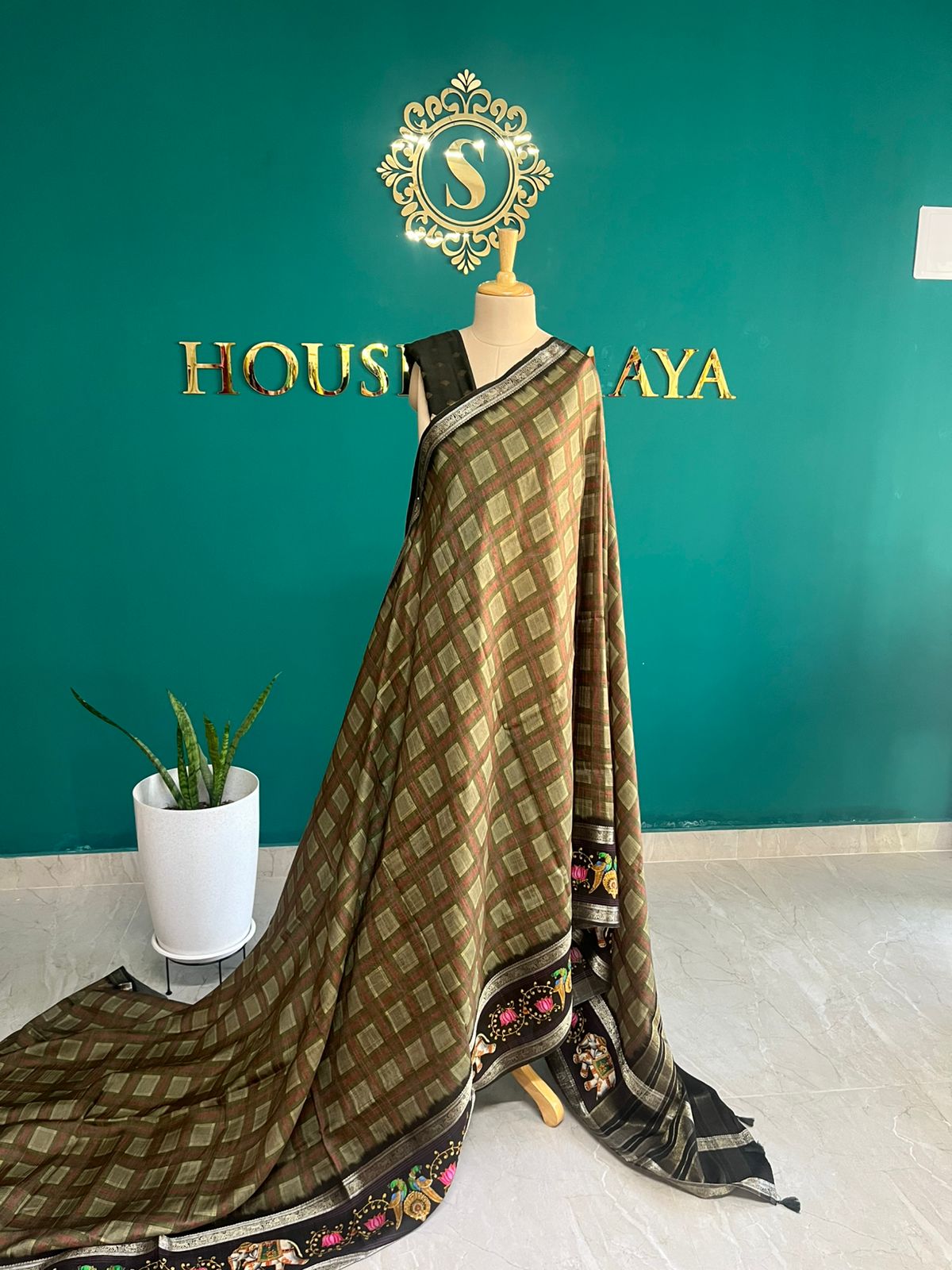 This saree features a subtle olive-green checked body paired with a striking digital Tanjore-inspired painted border, showcasing traditional motifs with a contemporary finish. The contrast border adds a regal and artistic touch to the overall look.