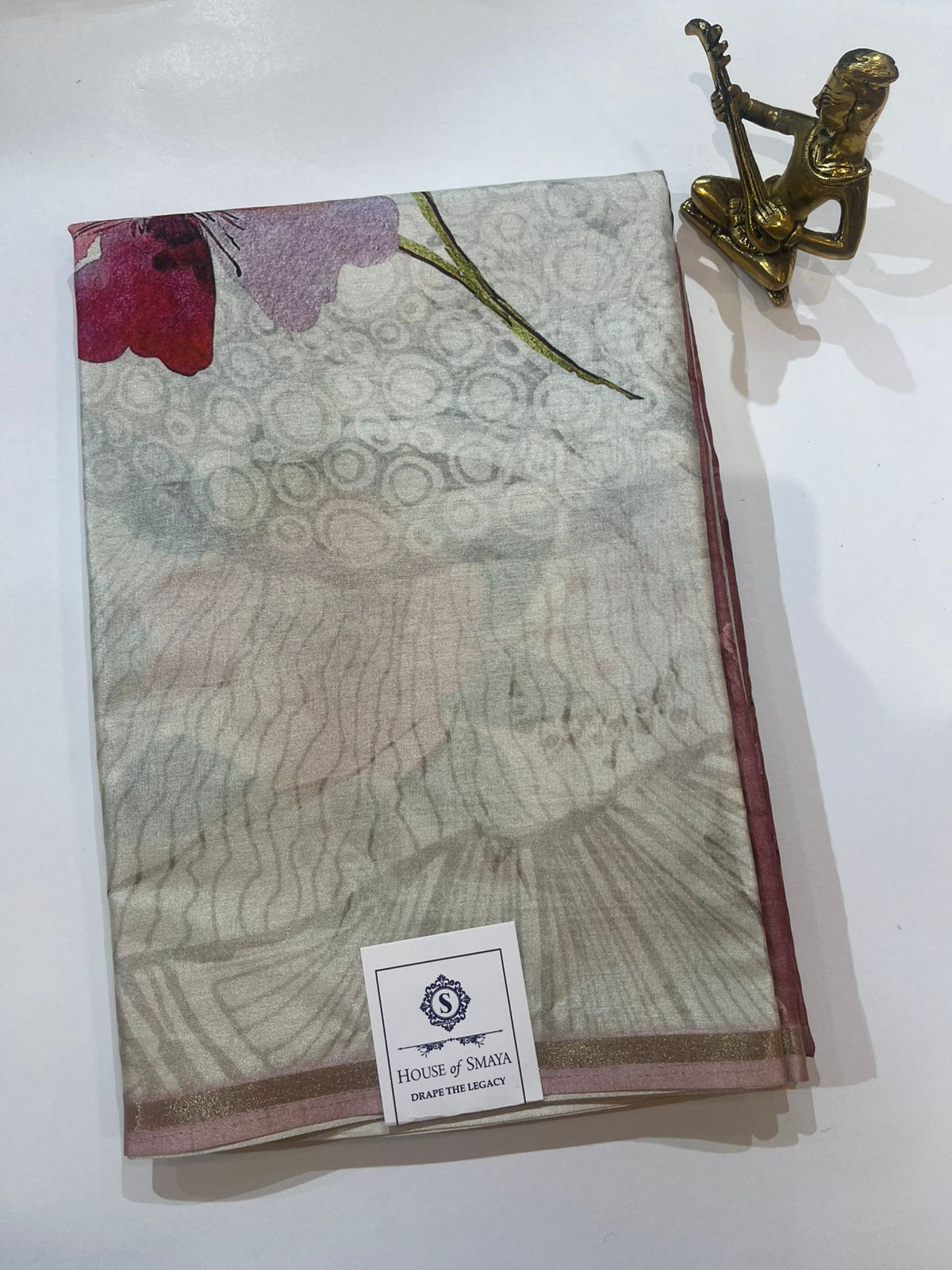 Pastel Grey Semi Silk Saree with Abstract Texture & Floral Accent