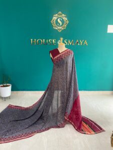 Crafted from lightweight georgette fabric, it drapes beautifully with a soft, flowy fall that enhances your silhouette. The subtle shimmer woven border adds understated glamour, making it perfect for daytime events, brunches, festive gatherings, and semi-formal occasions.