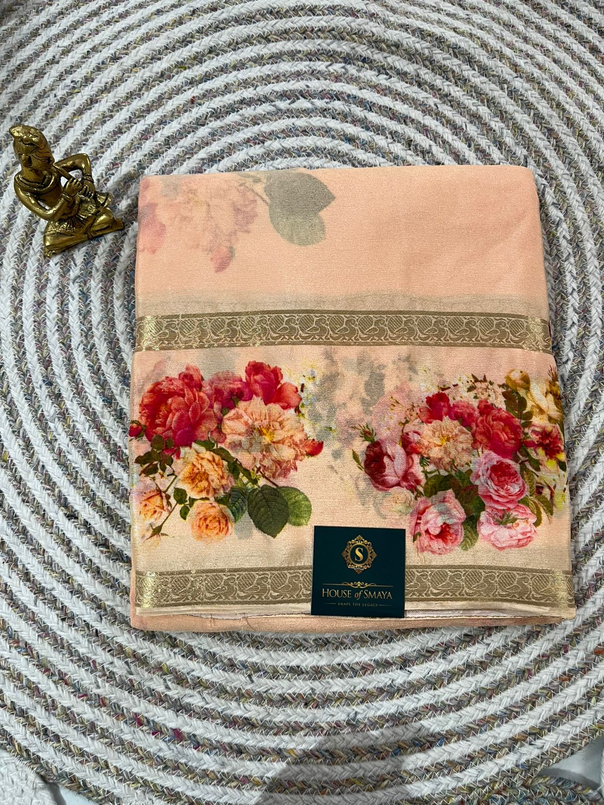 Peach Floral Printed Chiffon Saree with Elegant Gold Border