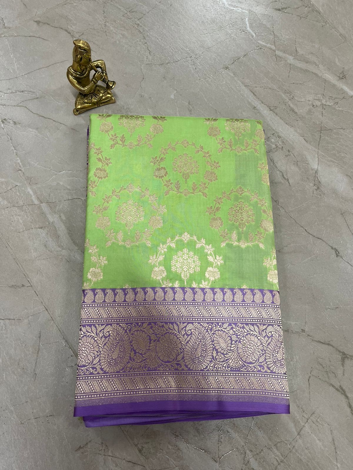 Elevate your festive and wedding wardrobe with this exquisite Pure Katan Silk Banarasi Saree in a refreshing lime-green hue, beautifully complemented by a rich royal purple zari border.