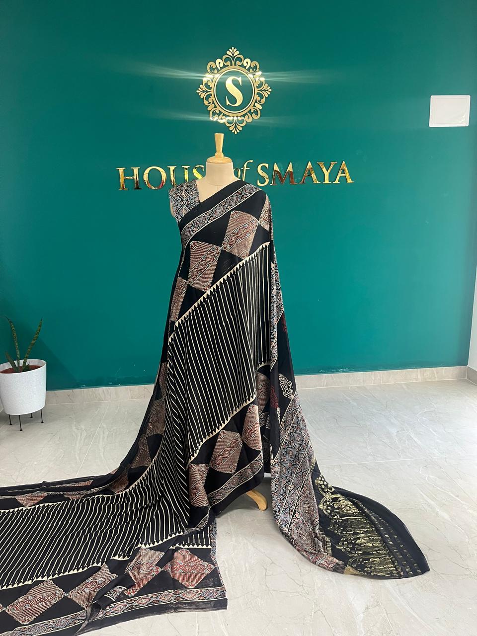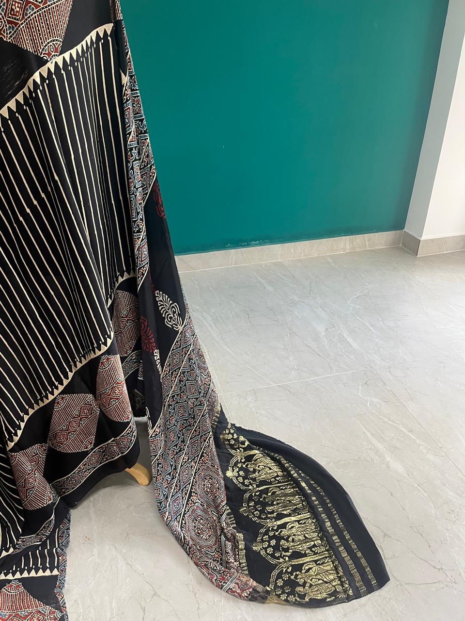 Pure Modal Silk Black Printed Saree with Geometric & Striped Design