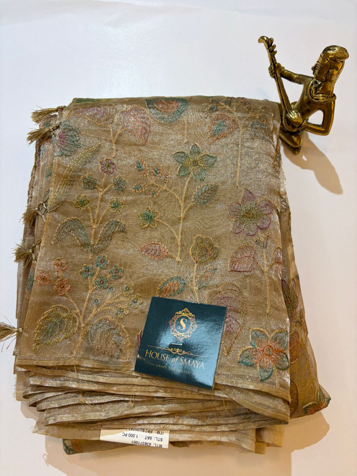 An embodiment of understated luxury, this Pure Tissue Saree showcases the ethereal beauty of finely woven tissue fabric paired with delicate hand-embroidered floral motifs. The soft gold-toned base shimmers gently, creating a luminous canvas for pastel threadwork inspired by blooming garden florals.