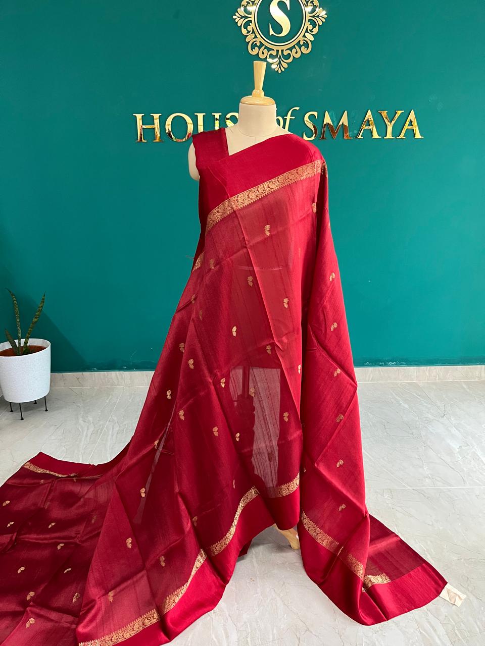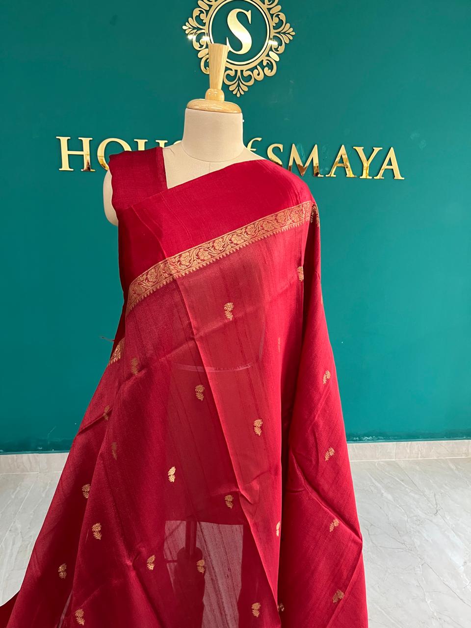 Pure Tussar Silk Red Saree with Golden Zari Work