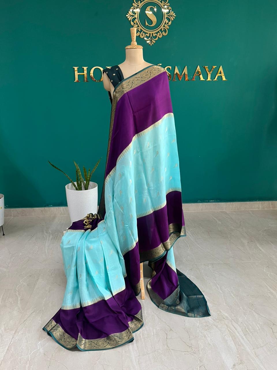 Purple & Aqua Blue Crepe Saree with Gold Zari Border and Butta Work