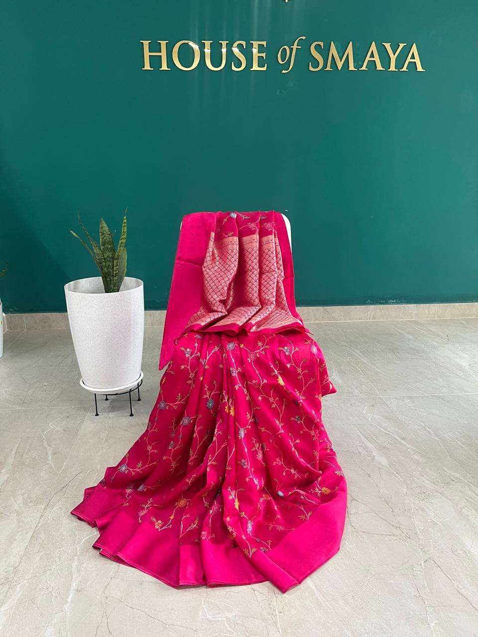Rani Pink Georgette Banarasi Saree with Floral Weave