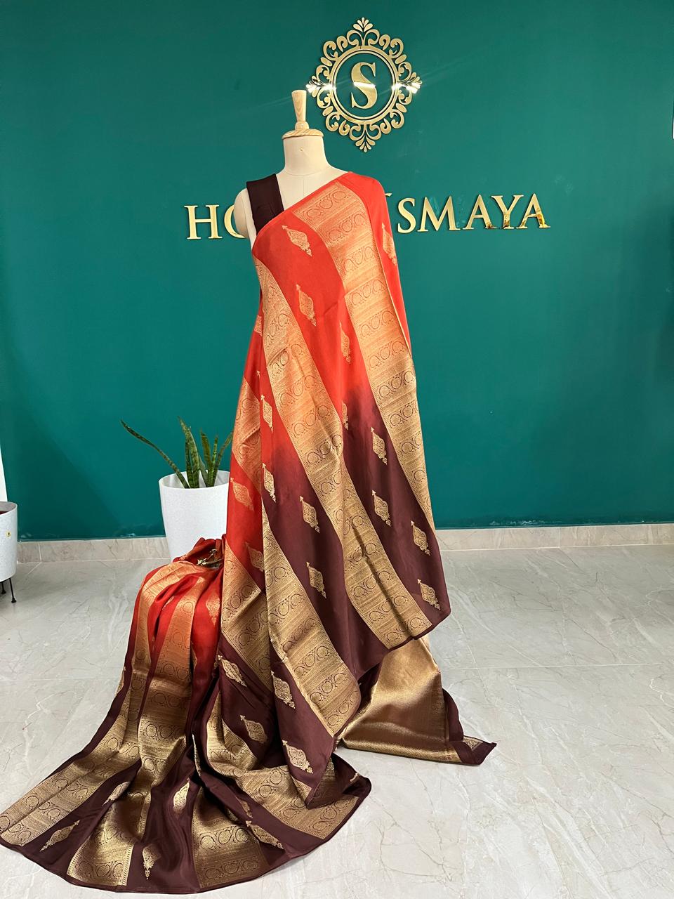 Red to Maroon Dual Tone Soft Silk Saree with Rich Gold Zari Border