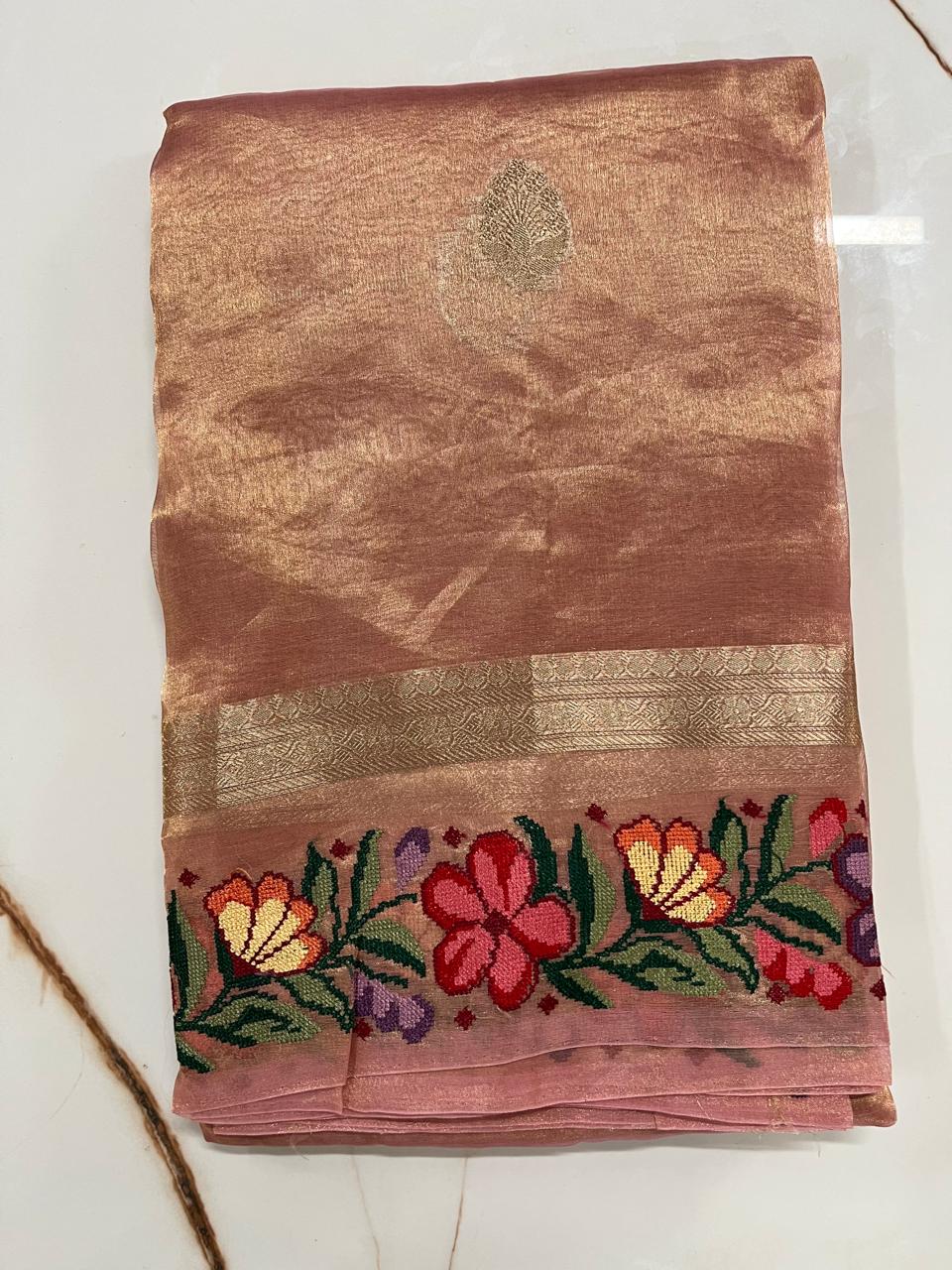 Rosewood Copper Pure Tissue Silk Saree with Paithani Floral Border