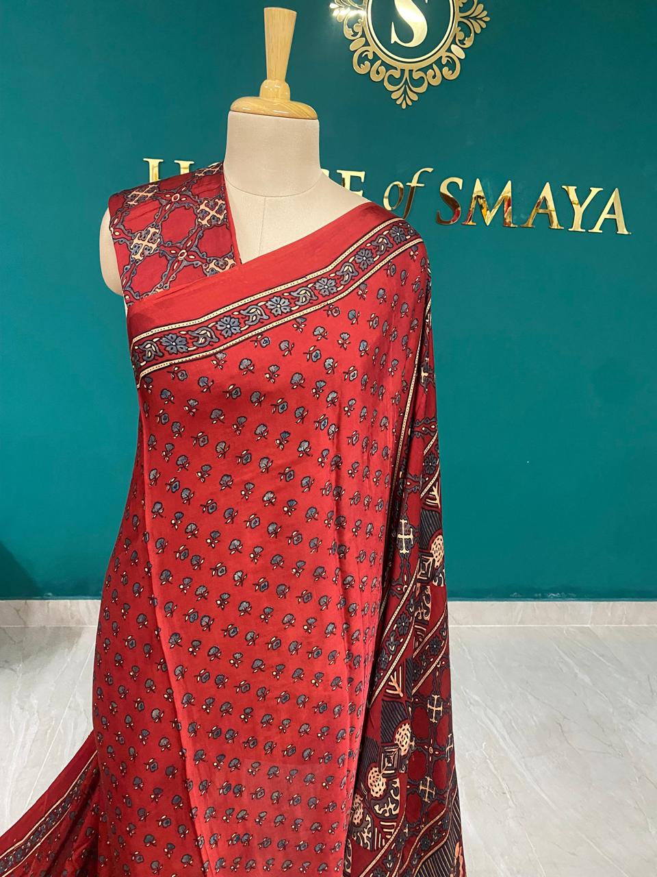 Rust Red Ajrakh Print Silk Saree with Zari Pallu